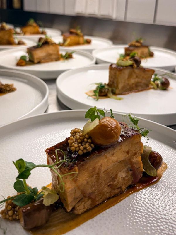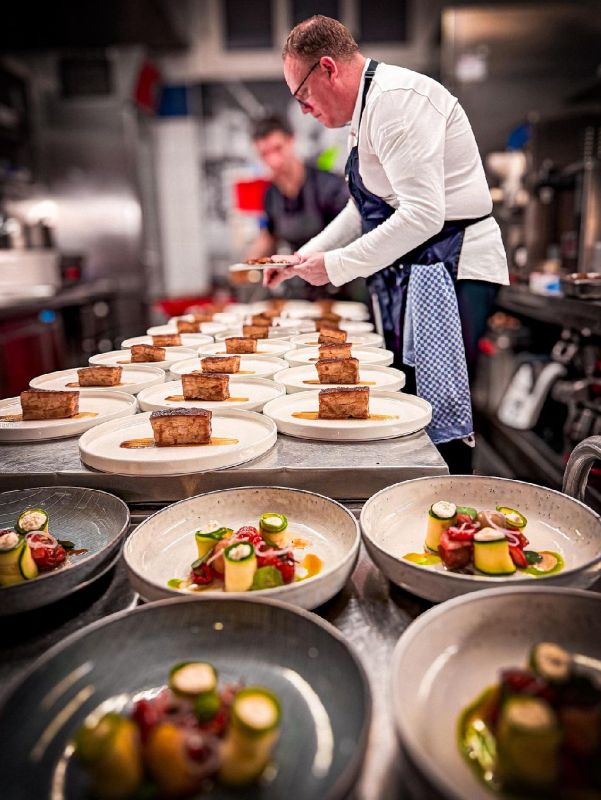 Den Auftakt machte das Team der Hohen Düne mit einer Neuinterpretation von Tomate mit Ricotta Creme, Zucchini und Kräuteröl. Es folgte ein Zwischengang aus Schwäbisch Hällischem Schweinebauch mit geräucherten Kastanien. Danach servierte das Küchenteam des Achterdiek eine Hummerbisque sowie als Hauptgang ein auf der Haut gebratenes Skreifilet mit Sauce Beurre Blanc und Pommes Soufflé. Den süßen Abschluss bildete eine Dessertvariation aus Passionsfrucht mit Pistazien nach einem Rezept von Lars Volbrecht, bevor Stefan Danzer mit einem herzhaften „Croque Monsieur“ vom Deichkäse mit hausgemachtem Feigensenf den letzten Gang servierte. Ein engagiertes Serviceteam sorgte dazu für die passenden Weine. Am Ende des Dinners wurden beide Küchenteams gemeinsam mit großem Applaus der Gäste empfangen.
