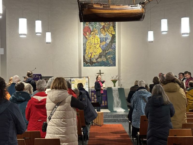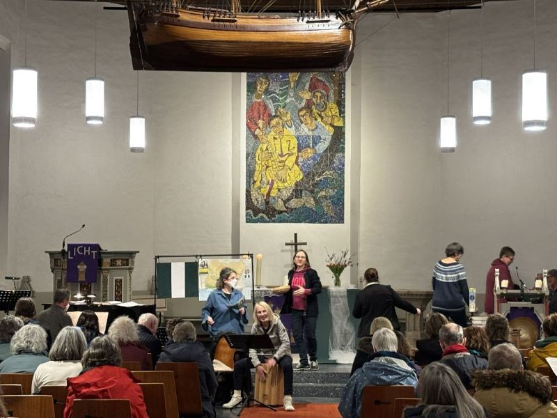 Dieses Gefühl war spürbar im Raum. Drei Frauen aus Nigeria erzählten ihre Geschichte, stellvertretend gesprochen von drei Frauen im Altarraum. Beatrice, eine junge Witwe, droht unter den Schwierigkeiten ihres Lebens erdrückt zu werden. Doch durch ihren Glauben und die Gemeinschaft findet sie neue Kraft. Für sie und ihre Stärke wird gebetet, damit sie den gesellschaftlichen Druck und die Ungerechtigkeit weiter aushalten kann.