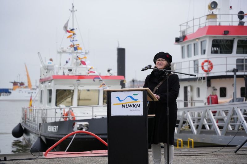 „Dieses Schiff ist für den NLWKN etwas ganz Besonderes“, unterstrich dann auch Anne Rickmeyer bei ihrer Festansprache. Es handele sich weder schiffsbautechnisch noch aufgabentechnisch um einen 1:1-Nachbau eines bereits vorhandenen Schiffs. „Die Anforderungen an Einsatzgebiet und Leistungsspektrum gehen über die seiner Vorgängerbauten weit hinaus“, so die Direktorin des Landesbetriebs. Rickmeyer nutzte den Festakt, um an die Verdienste des langjährigen NLWKN-Aufgabenbereichsleiters Schiffsbetrieb Dirk Oberliesen zu erinnern. Oberliesen, der im vergangenen Sommer nach kurzer schwerer Krankheit verstorben war, hatte während seiner Dienstzeit die Modernisierung der NLWKN-Schiffsflotte für die Aufgaben im Bereich Küstenschutz und Schadstoffunfallbekämpfung wesentlich vorangetrieben. Als Projektingenieur hatte er auch am Bau der „Memmert“ mitgewirkt. „Dass wir heute hier eine feierliche Schiffstaufe begehen dürfen, verdanken wir allen voran auch Dirk Oberliesen“, betonte Anne Rickmeyer.